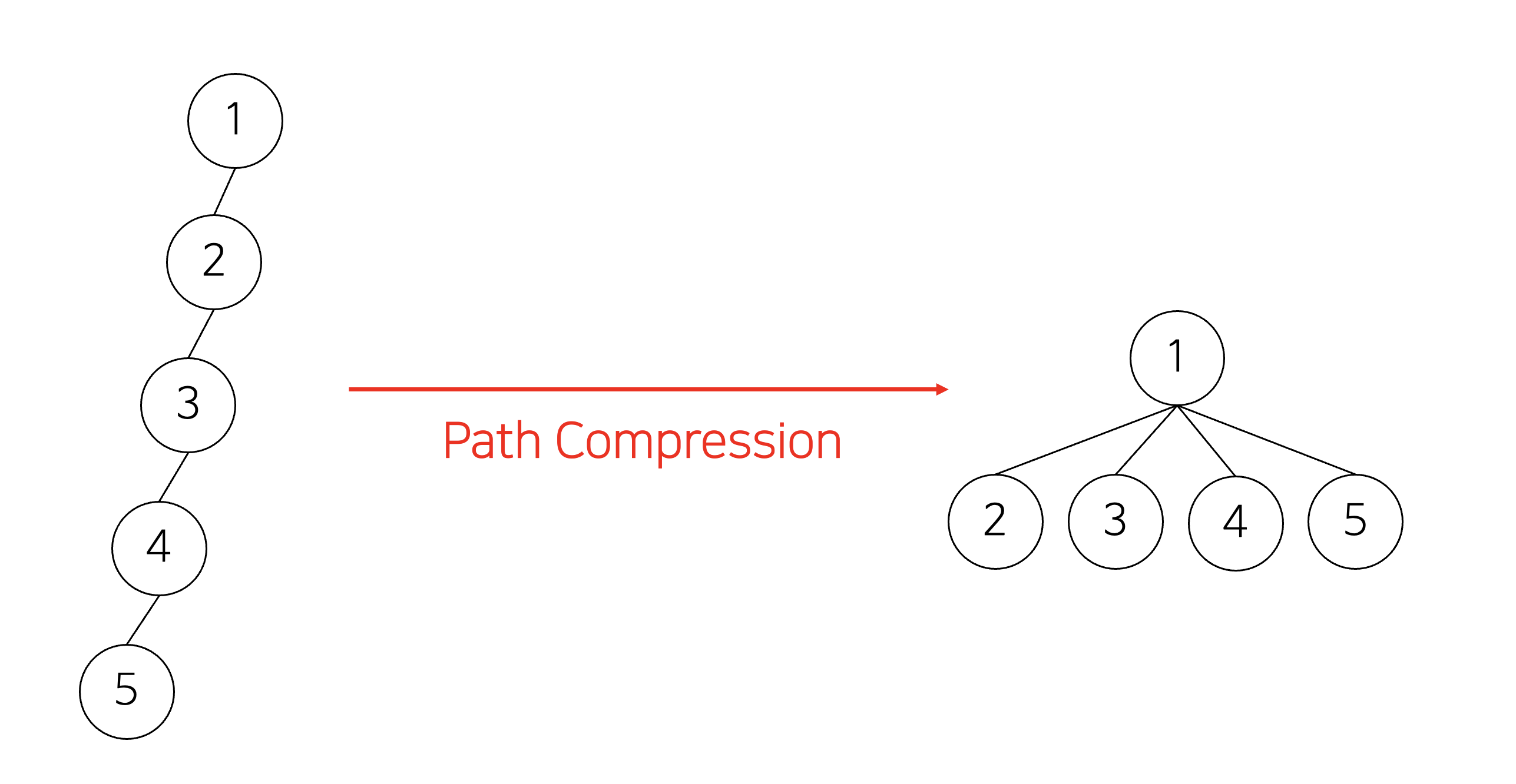 따라서 우리는 find 함수의 시간복잡도를 줄여야 합니다! 어떻게요? 경로 압축을 통해서요! 즉, find 하면서 만난 모든 값의 부모 노드를 root로 만듭니다. find 연산을 재귀적으로 하면 루트노드까지 모든 부모 노드를 방문하게 되는데, 방문할 때마다 그 부모 노드의 부모 노드를 자신의 부모 노드로 만들어 최종적으로는 모든 원소가 루트 노드로 연결되도록 하는 방법입니다.