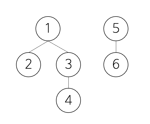 예를 들어, {1, 2, 3}, {3, 4}, {5, 6} 이렇게 3개의 집합이 있을 때 이 집합들을 union-find 자료구조로 표현하면 아래처럼 트리로 표현할 수 있습니다. 숫자가 더 큰 노드일 수록 더 아래쪽에 배치하였습니다.