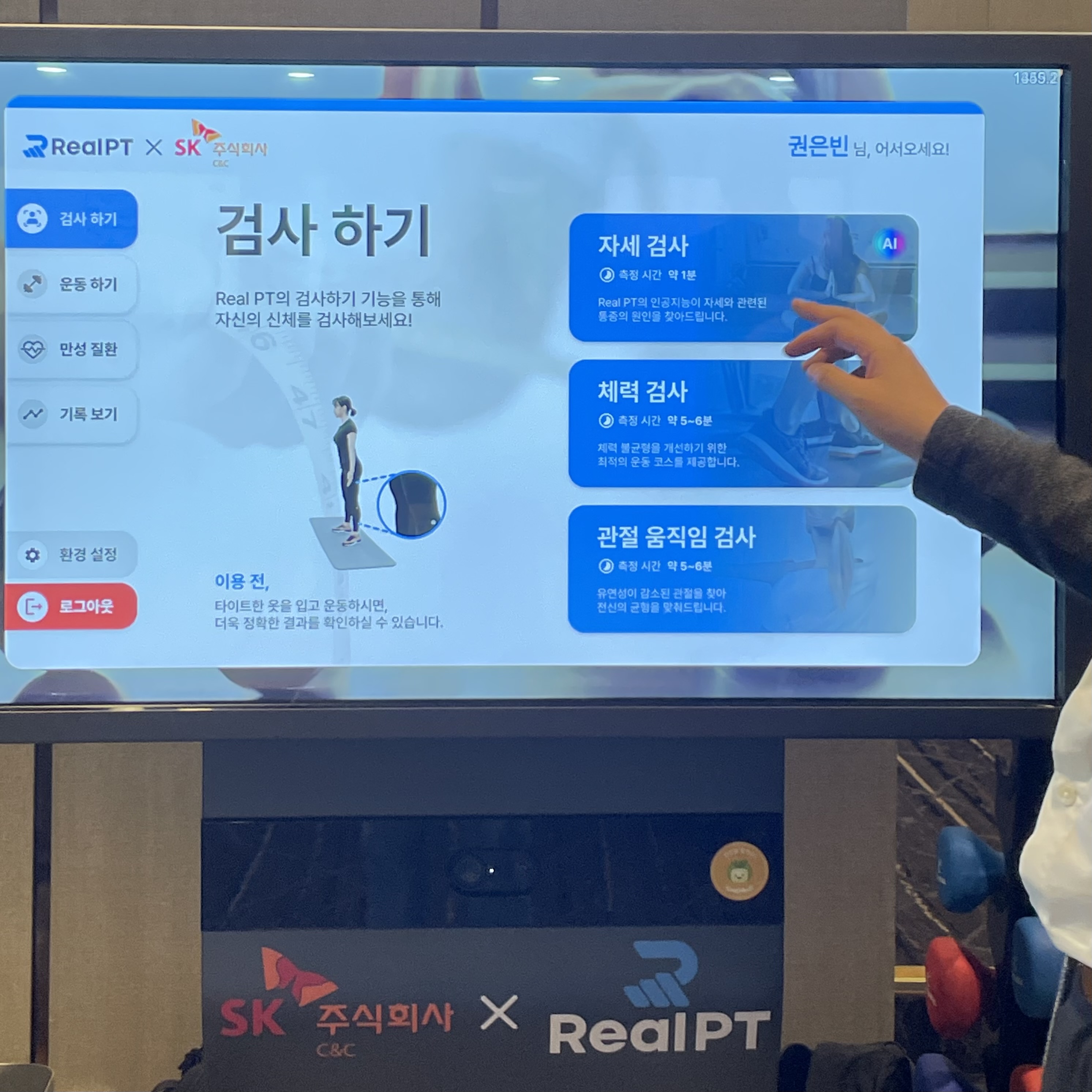 RealPT는 모션 인식 기술을 바탕으로 정확한 신체 검사와 펄스널 트레이닝 프로그램을 제공해요.