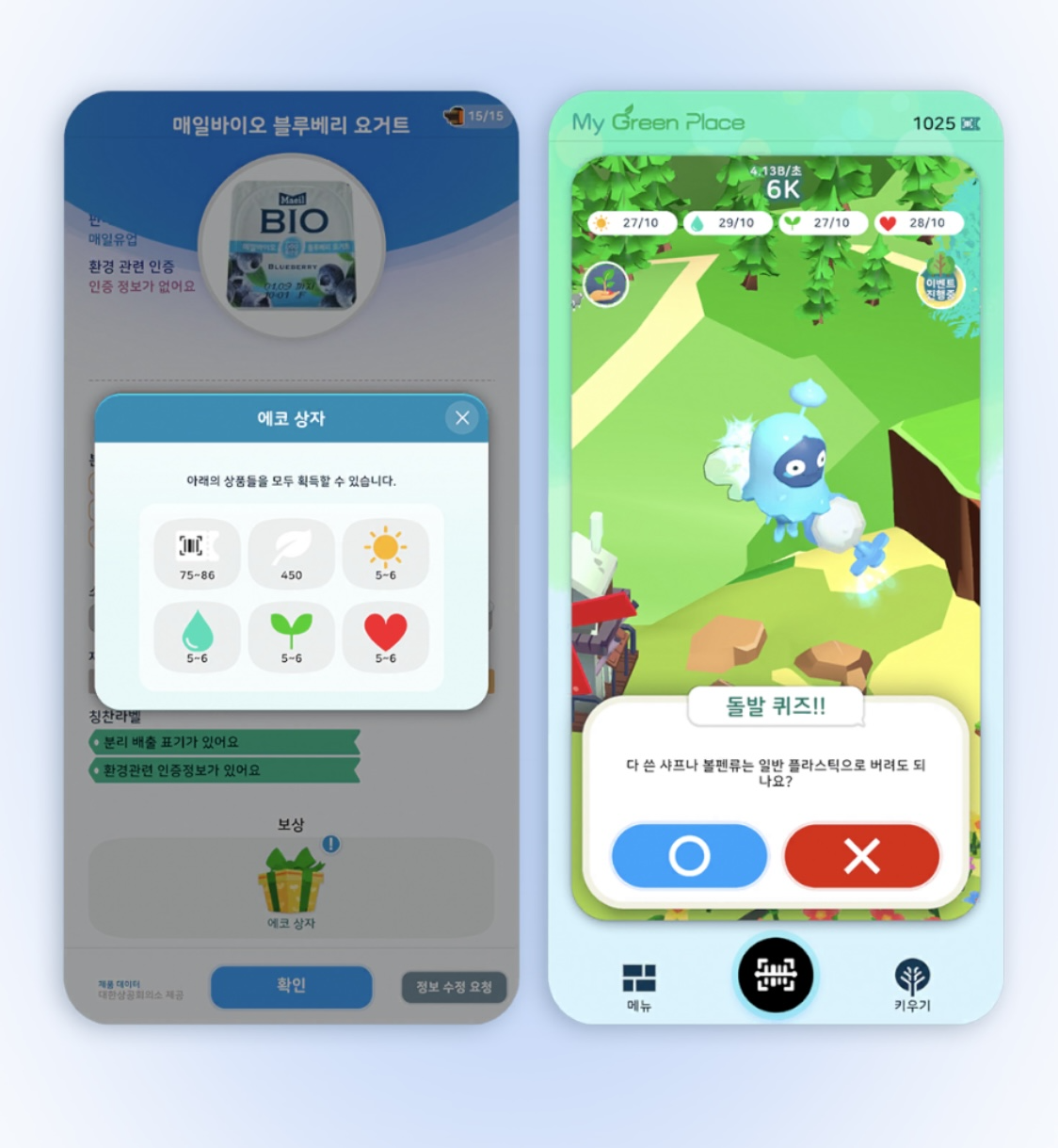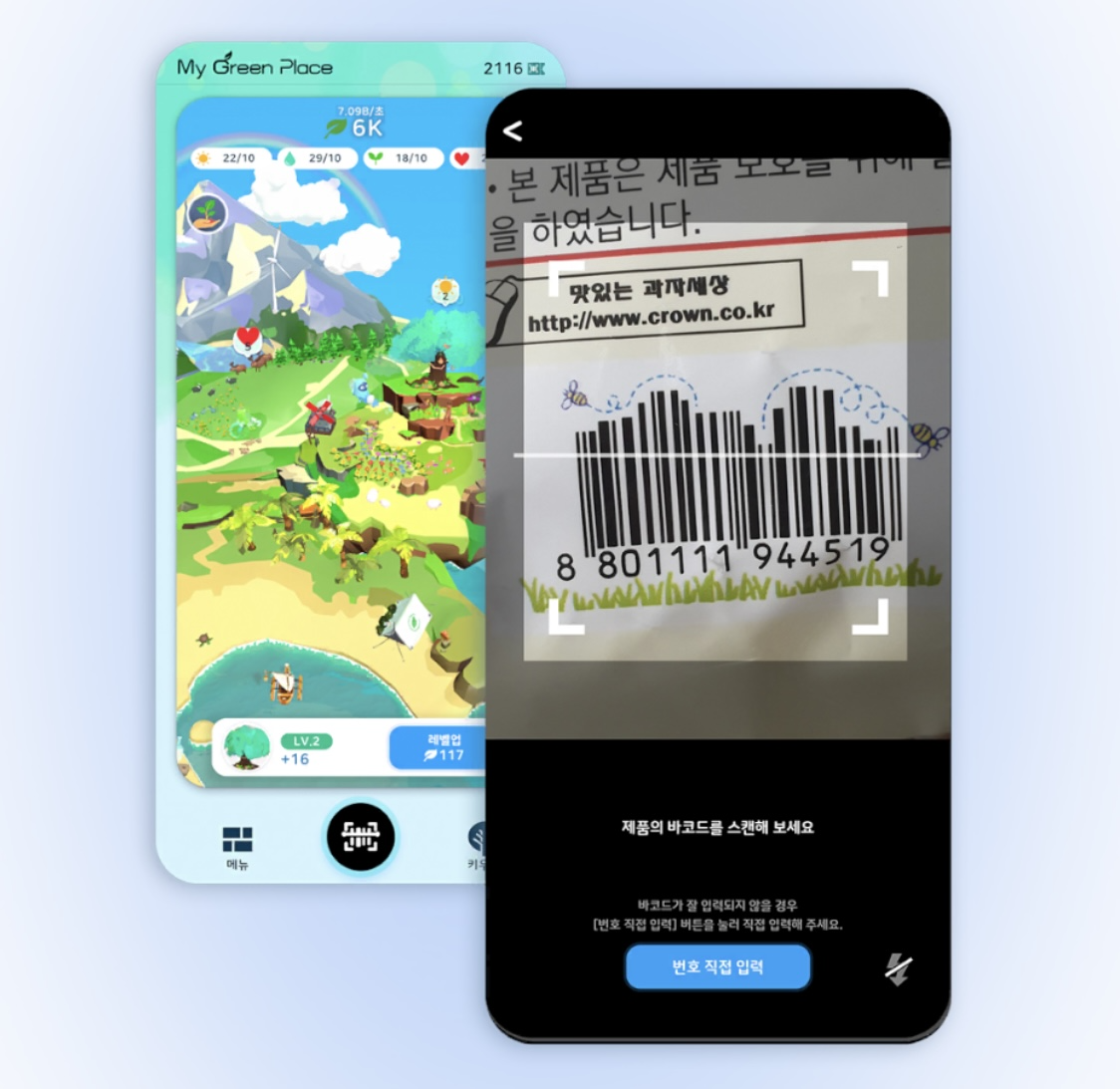 바코드를 카메라로 찍으면 플라스틱 재활용 정보를 확인할 수 있고, 게임 안에서 보상을 받을 수 있어요! 이렇게 재활용 보상으로 마이 그린 플레이스를 초록초록하게 꾸밀 수 있는 게임입니다! 어플이 너무 귀엽고 그림들도 예뻐서 꾸미는 재미가 있었어요 🌱