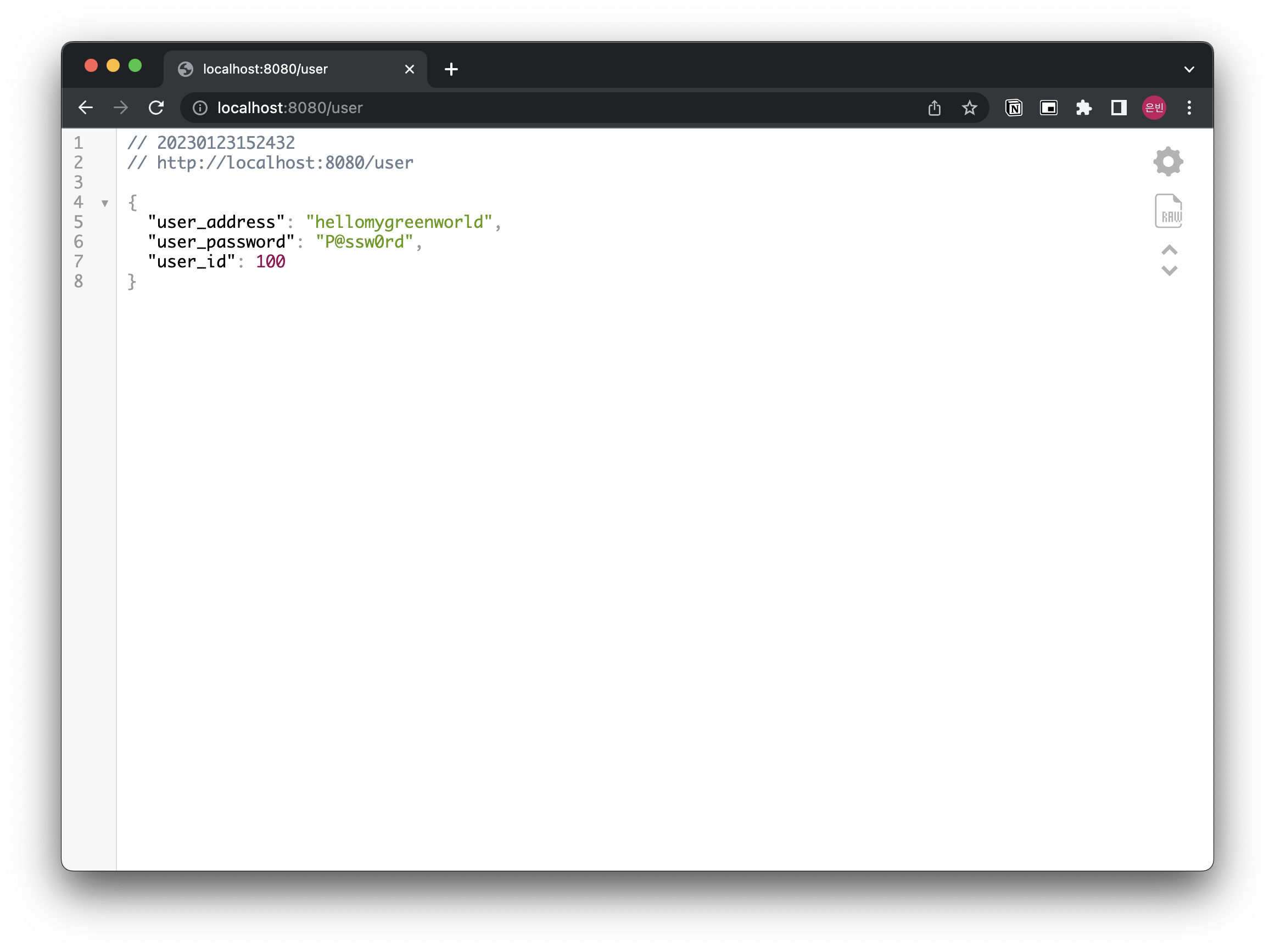 리턴값으로 ResponseEntity에 제네릭 타입을 지정한 후, status code를 HTTPStatus.CREATED로 지정하였습니다. 위와 같이 생성되었을 때의 상태 코드값인 201을 확인할 수 있습니다. 물론 body에 userDTO 객체를 넣어 JSON 타입을 리턴할 때와 response body의 내용은 동일합니다.