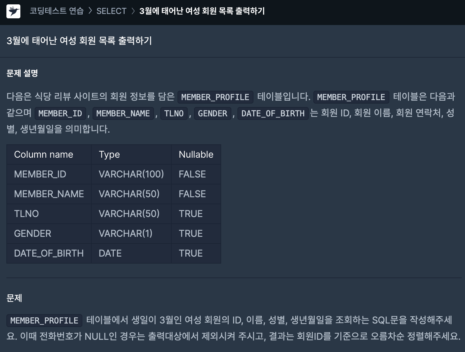 DATE_OF_BIRTH를'%Y-%m-%d'형식에 맞추어SELECT합니다.WHERE NOT TLNO IS NULL절로 전화번호가 null인 행을 제외합니다.