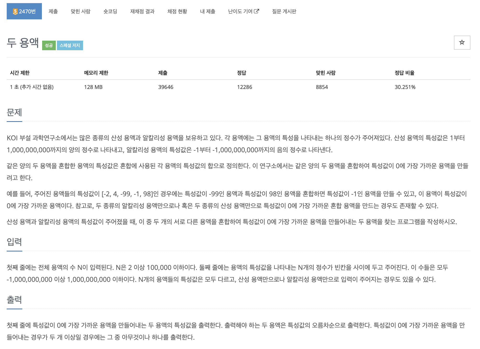 mix์ ์ ๋๊ฐ์ด 0๊ณผ ๊ฐ์ฅ ๊ฐ๊น๋๋ก ํ๋ ๋ ์ฉ์ก์ ์ ํํ๋ ๊ฒ์ด๋ฏ๋กmix์ ์ ๋๊ฐ์ ํ์ฌmin๊ฐ๊ณผ ๋น๊ตํ์ฌ ๋ ์๋ค๋ฉดmin๊ณผresult๋ฅผ ์ ๋ฐ์ดํธํฉ๋๋ค. mix๊ฐ์ด ์์๋ผ๋ฉด ํฌ ํฌ์ธํฐ ์กฐ์ ์,start๋ฅผ 1 ์ฆ๊ฐ์์ผ ์ดํ ๊ณ์ฐ๋mix๊ฐ์ ์ฆ๊ฐ์์ผ 0์ ๊ฐ๊น๋๋ก ํฉ๋๋ค. ๋ฐ๋๋กmin๊ฐ์ด ์์๋ผ๋ฉด ํฌ ํฌ์ธํฐ ์กฐ์ ์,end๋ฅผ 1 ๊ฐ์์์ผmix๊ฐ์ด 0์ ๊ฐ๊น๋๋ก ํฉ๋๋ค.mix๊ฐ์ด 0์ด๋ผ๋ฉด ๋์ด์ ๊ฐ์ ํ ์ฌํญ์ด ์๊ธฐ ๋๋ฌธ์ ๋ฐ๋ณต๋ฌธ์ ์ข ๋ฃํฉ๋๋ค.
