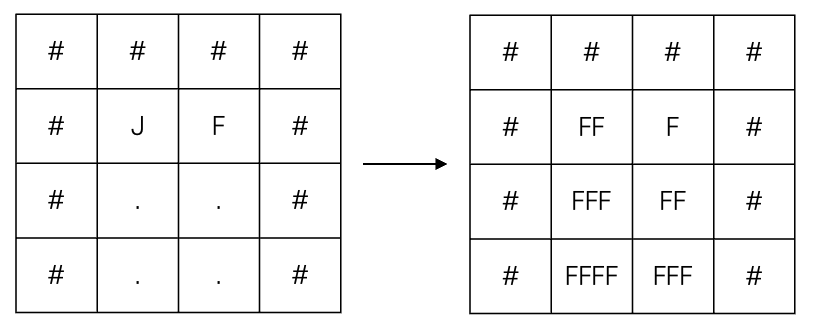 if graph[ny][nx] == "." or graph[ny][nx].count("F") - 1 > graph[y][x] + 1: