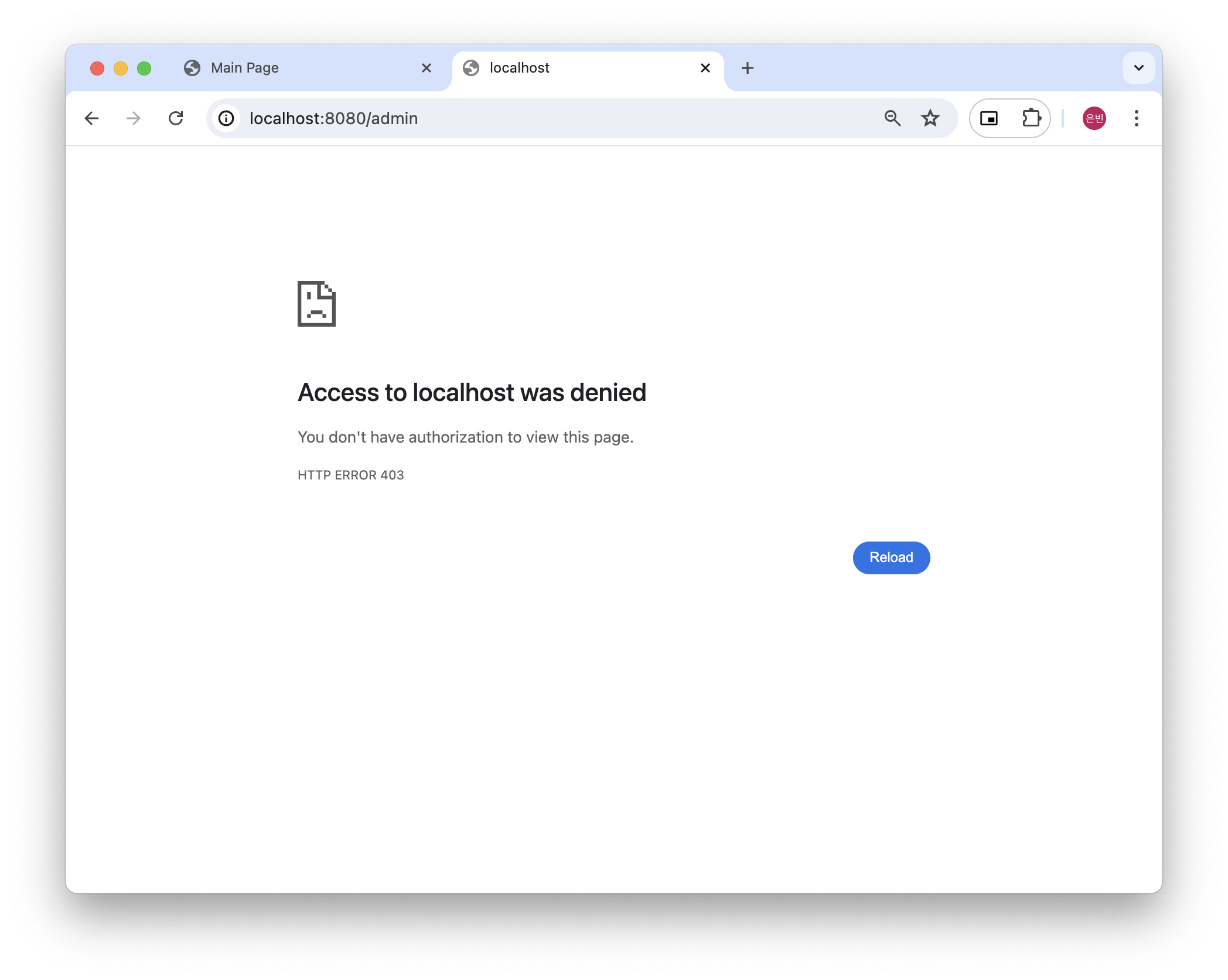 위와 같이 SecurityConfig 클래스를 작성하고 "/" 요청을 하면 이 요청은 모든 유저(로그인을 하지 않은 유저까지 포함)에게 허용되기 때문에 바로 Main Page가 열리고(main.html) "/admin" 요청을 하면 ADMIN role을 가진 유저만 허용되기 때문에403에러(Access to loaclahost was denied)가 발생합니다!