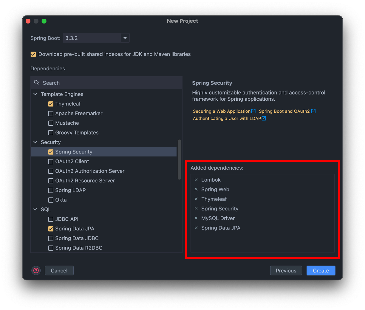 저는 SecurityExample이라는 이름으로 프로젝트를 생성하였고, 6개의 의존성(Lombok, Spring Web, Tymeleaf, Spring Security, MySQL Driver, Spring Data JPA)을 추가하였습니다.