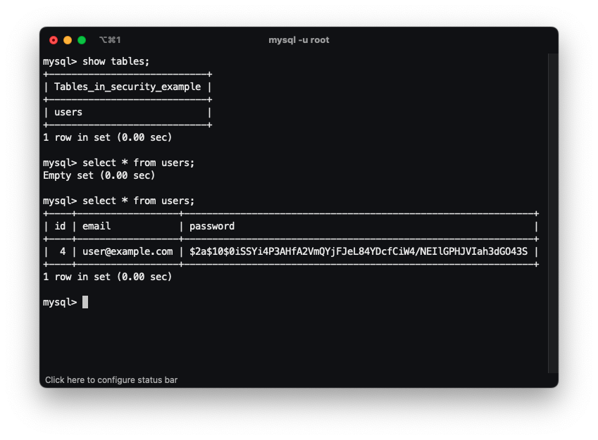 그럼 이렇게 users 테이블에 이메일과 암호화된 비밀번호가 저장된 것을 확인할 수 있습니다.