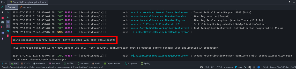 위와 같이 코드를 작성하고 /admin 요청을 보내면 이전에 403에러만 뱉었던 화면이 아니라 /login 페이지가 열리게 됩니다! 그리고 id를 user로 입력하고 password는 터미널에 자동 생성된 비밀번호를 입력하여 로그인하면 루트 경로로 이동하게 됩니다.