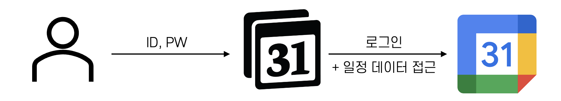 만약 OAuth없이 구현한다고 하면 사용자가 노션 캘린더에 구글 아이디와 비밀번호를 주고, 노션 캘린더는 사용자의 아이디와 비밀번호로 직접 구글캘린더에 로그인하여 사용자의 일정 데이터에 접근할 것입니다.