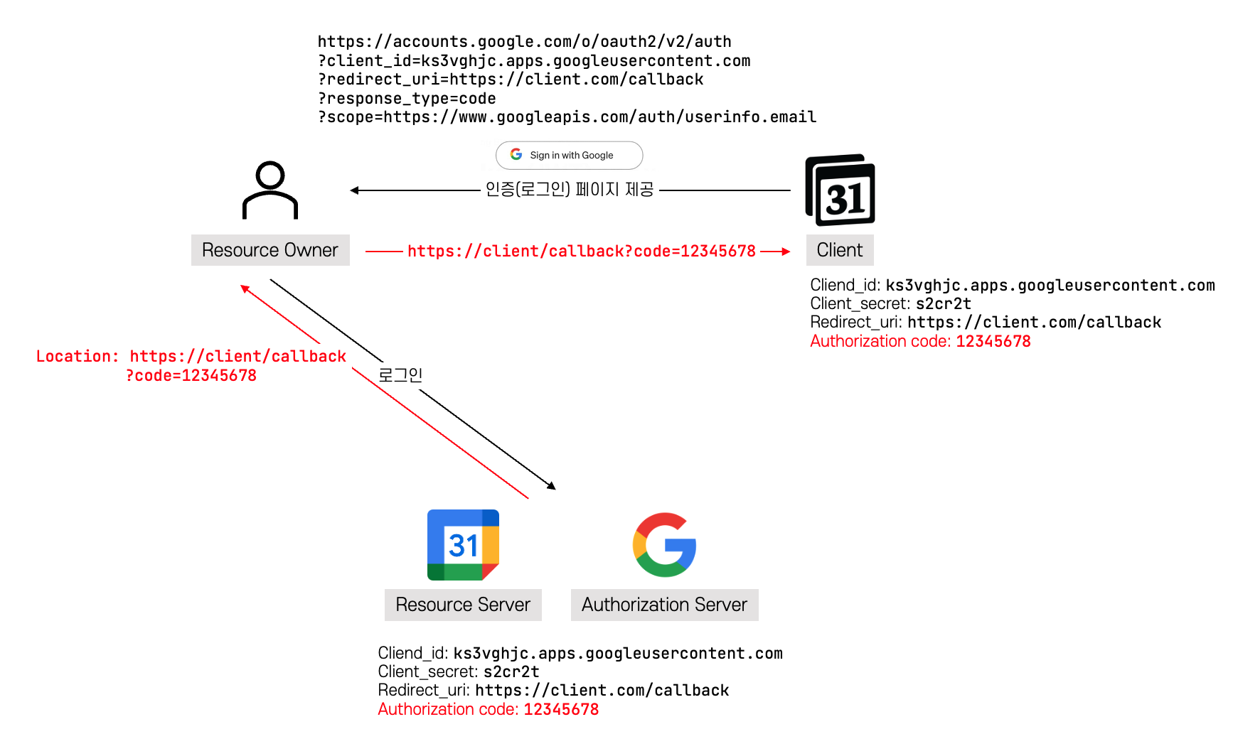 사용자는 해당 응답을 받으면 바로 리디렉션 URI로 리다이렉트하게되고 따라서 클라이언트는 URL에 붙어있는 쿼리 파라미터를 통해 Authorization code를 획득하게 됩니다. 이로써 인증서버와 Client 모두 사용자의 인증이 완료되었다는 credential인 Authorization code를 가지게 됩니다.