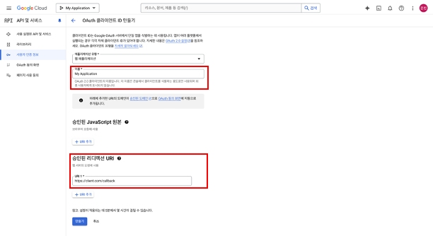 우선, Authorization Server에 클라이언트를 등록해야합니다. 사용하고자하는 인증 플랫폼이 여러개라면 각각 등록을 해주어야 합니다. 여기서는 구글에서 등록을 해보겠습니다. GCP(Google Cloud Platform)에서 프로젝트 생성 후, API 및 서비스 탭의 사용자 인증 정보 만들기 + OAuth 클라이언트 ID를 클릭합니다.