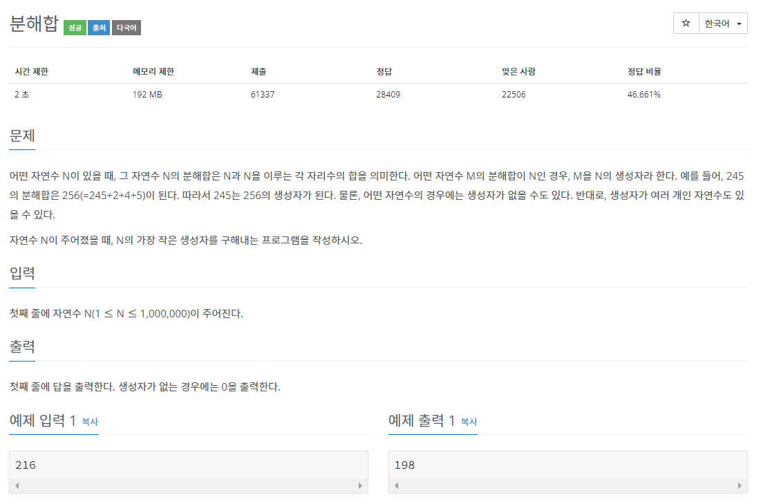 어떤 자연수 N이 있을 때, 그 자연수 N의 분해합은 N과 N을 이루는 각 자리수의 합을 의미한다. 어떤 자연수 M의 분해합이 N인 경우, M을 N의 생성자라 한다. 예를 들어, 245의 분해합은 256(=245+2+4+5)이