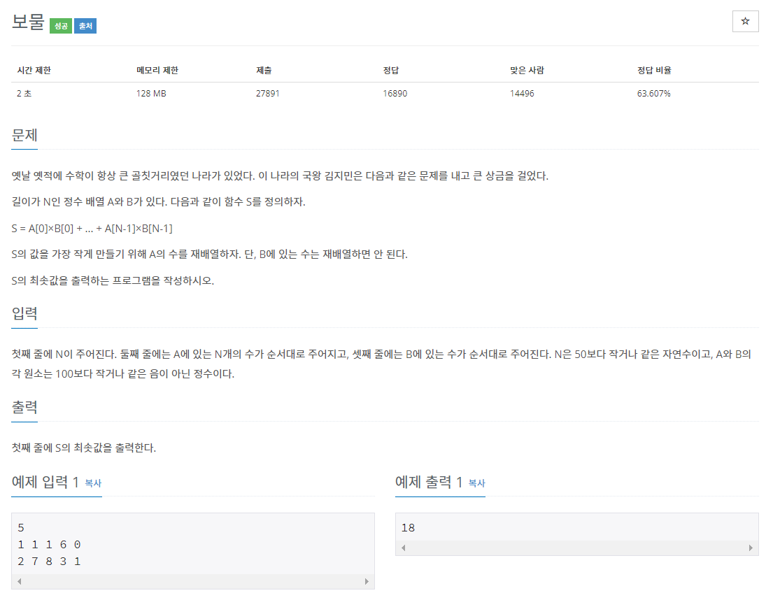 따라서 A는 오름차순 정렬, B는 내림차순 정렬하여 같은 인덱스의 원소를 각각 곱해 더해주면 정답이다.