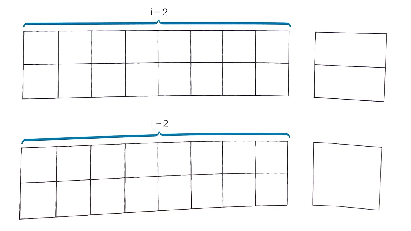 : i-2 이후로 길이 2를 채워주어야 하므로 선택할 수 있는 덮개의 조합은 2x2 1개 또는 1x2 2개로 2가지이다.