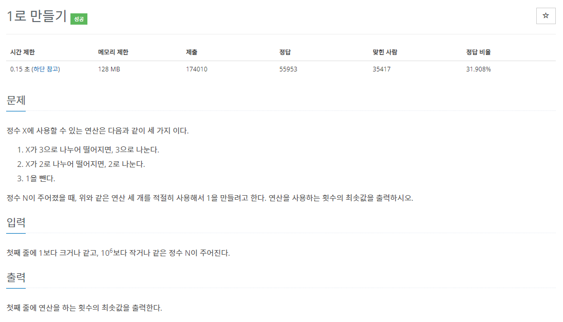 d를 생성한다. - 문제 해결 아이디어는 점화식으로 표현하면 $$a_i = min(a_{i_1}, a_{i/2}, a_{i/3})+1$$이다.
