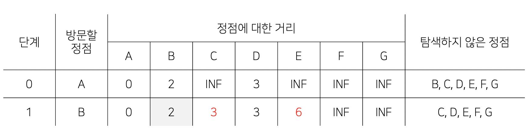 - 2단계 후, 탐색하지 않은 정점들 중에서 가장 가까운 정점인 C를 방문합니다.