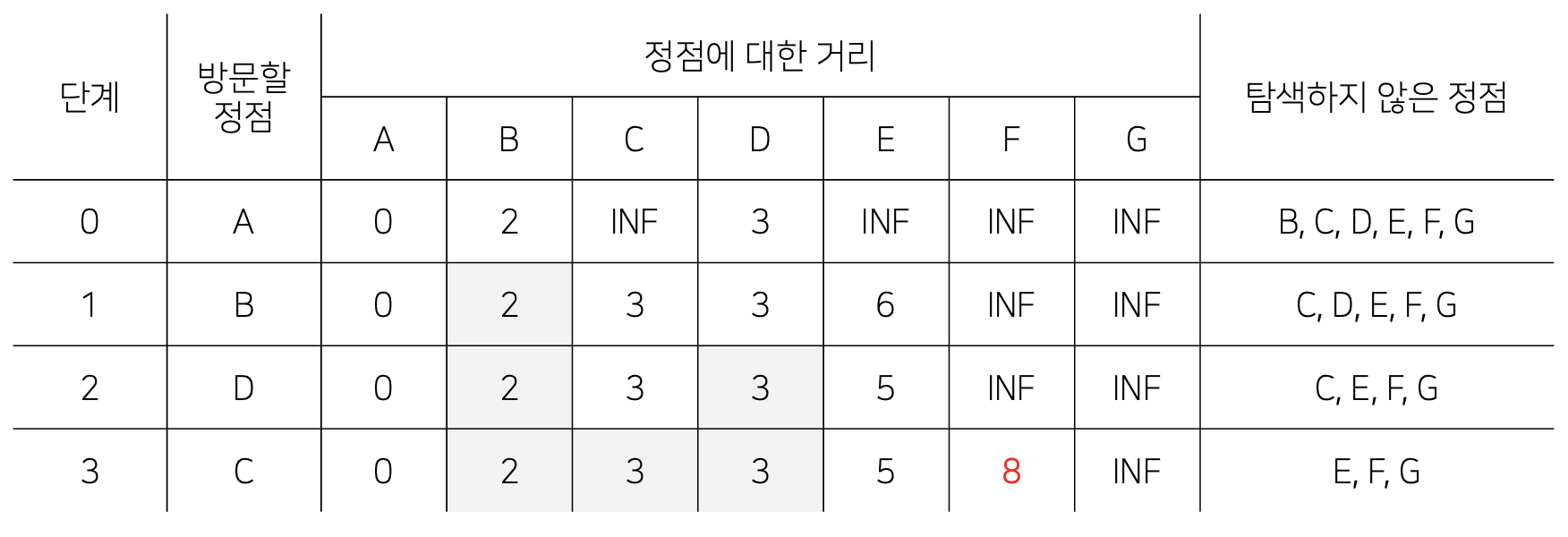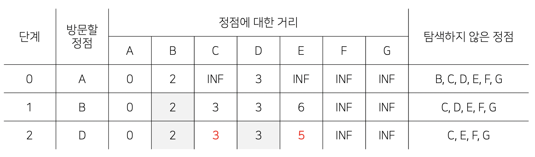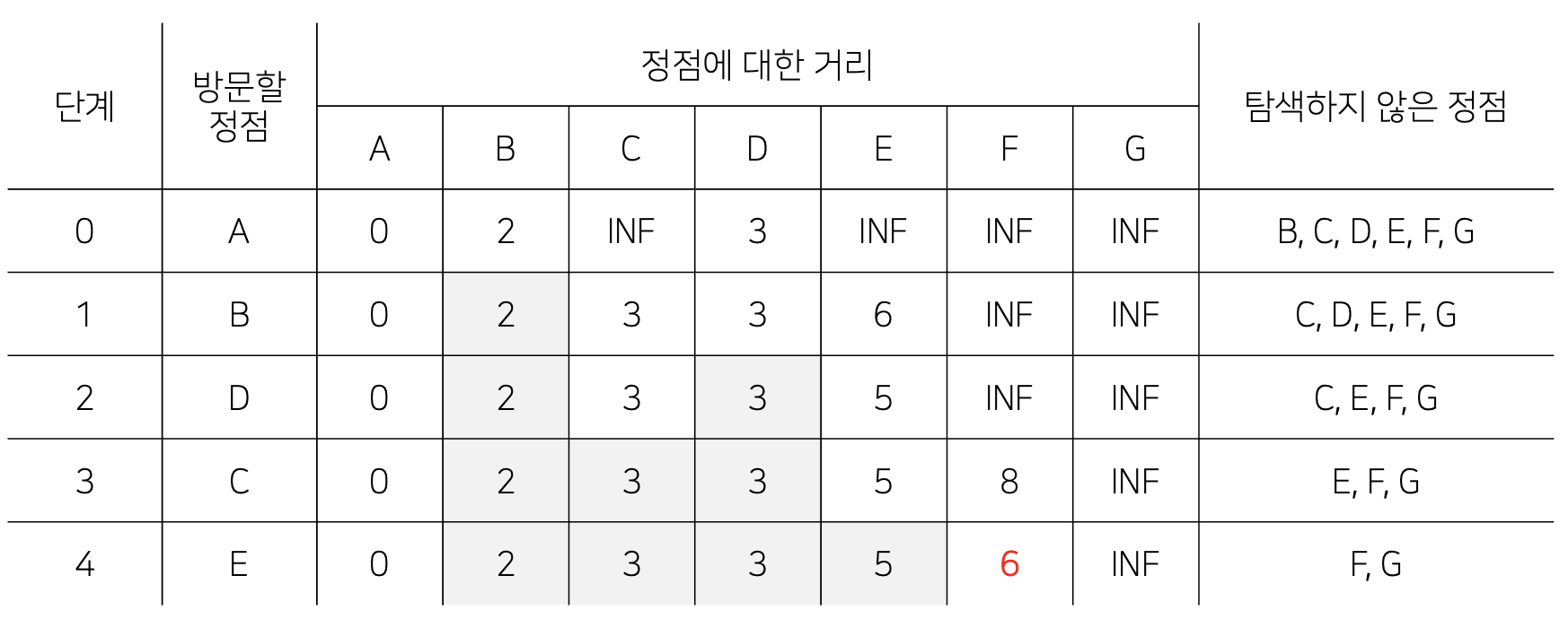 - 3단계 후, 탐색하지 않은 정점들 중에서 가장 가까운 정점인 E를 방문합니다.
