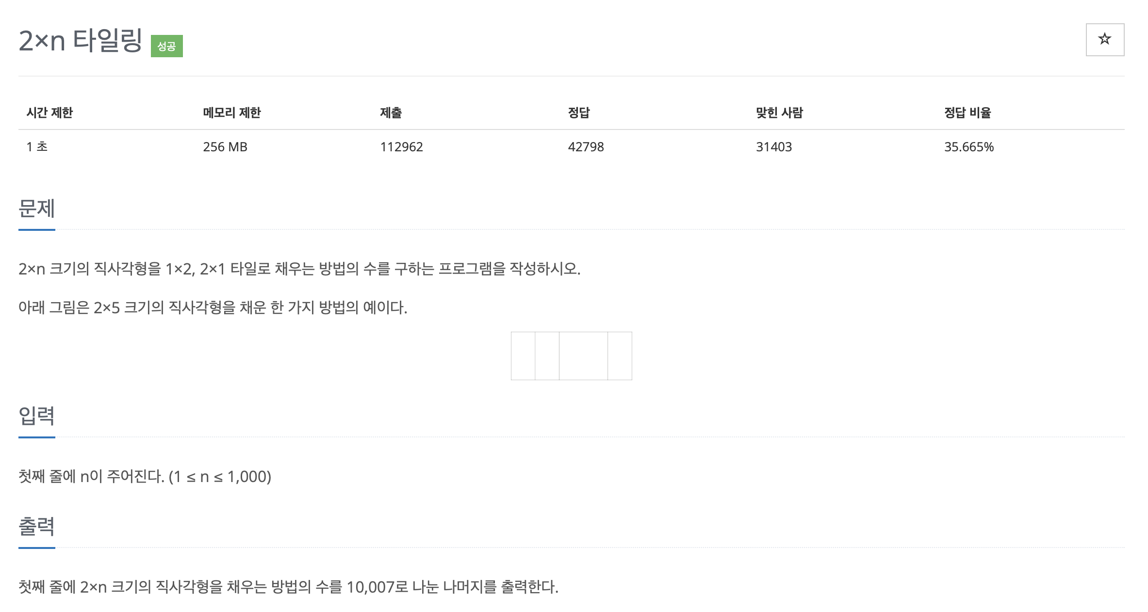2×n 크기의 직사각형을 1×2, 2×1 타일로 채우는 방법의 수를 구하는 프로그램을 작성하시오. 아래 그림은 2×5 크기의 직사각형을 채운 한 가지 방법의 예이다.
