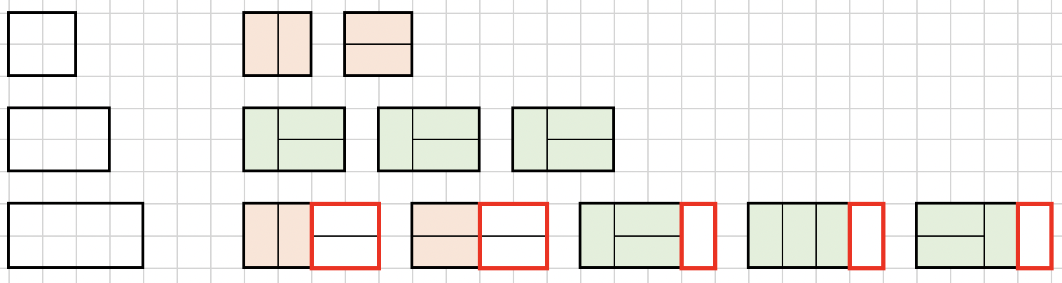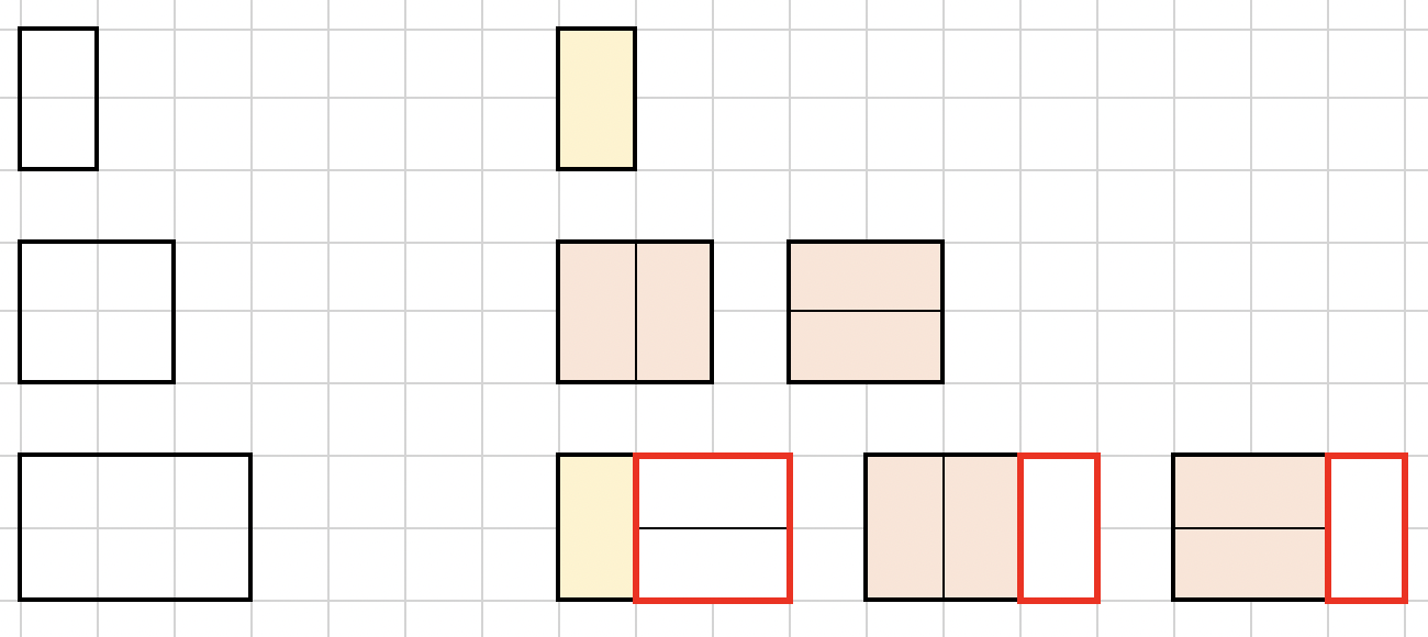 2x4 타일 또한 앞의 방법처럼 2x2 타일에 1x2 타일 2개를 붙이고, 2x3타일에 2x1 타일 1개를 붙이면됩니다.
